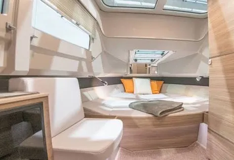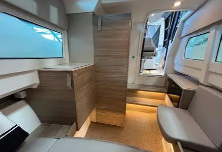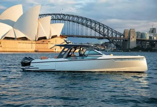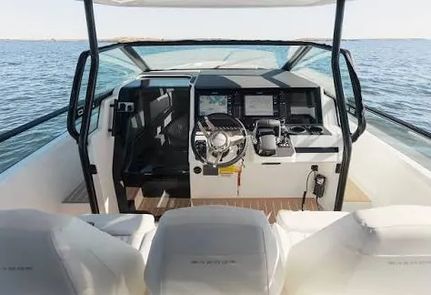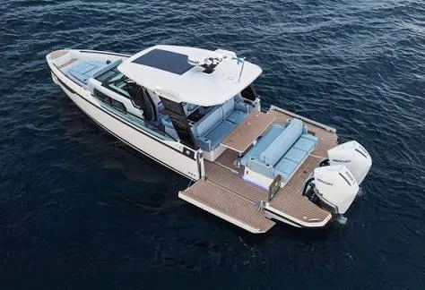 Le day-cruiser qui redéfinit la liberté. Design nordique affûté, double Mercury V8 300 ch, stabilisateur Seakeeper 2 (Gyro), joystick JPO : confort, précision et élégance sur mer.