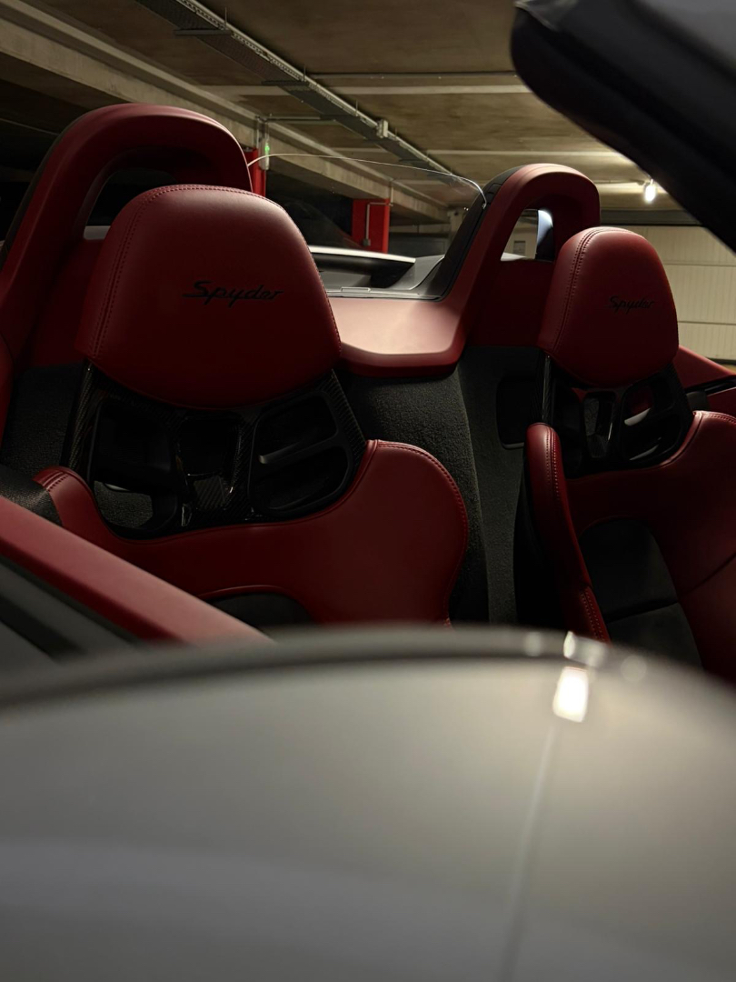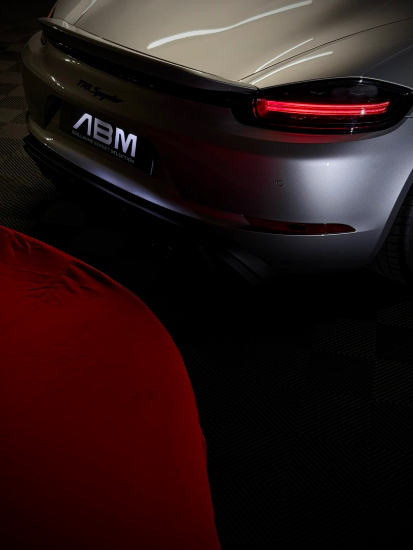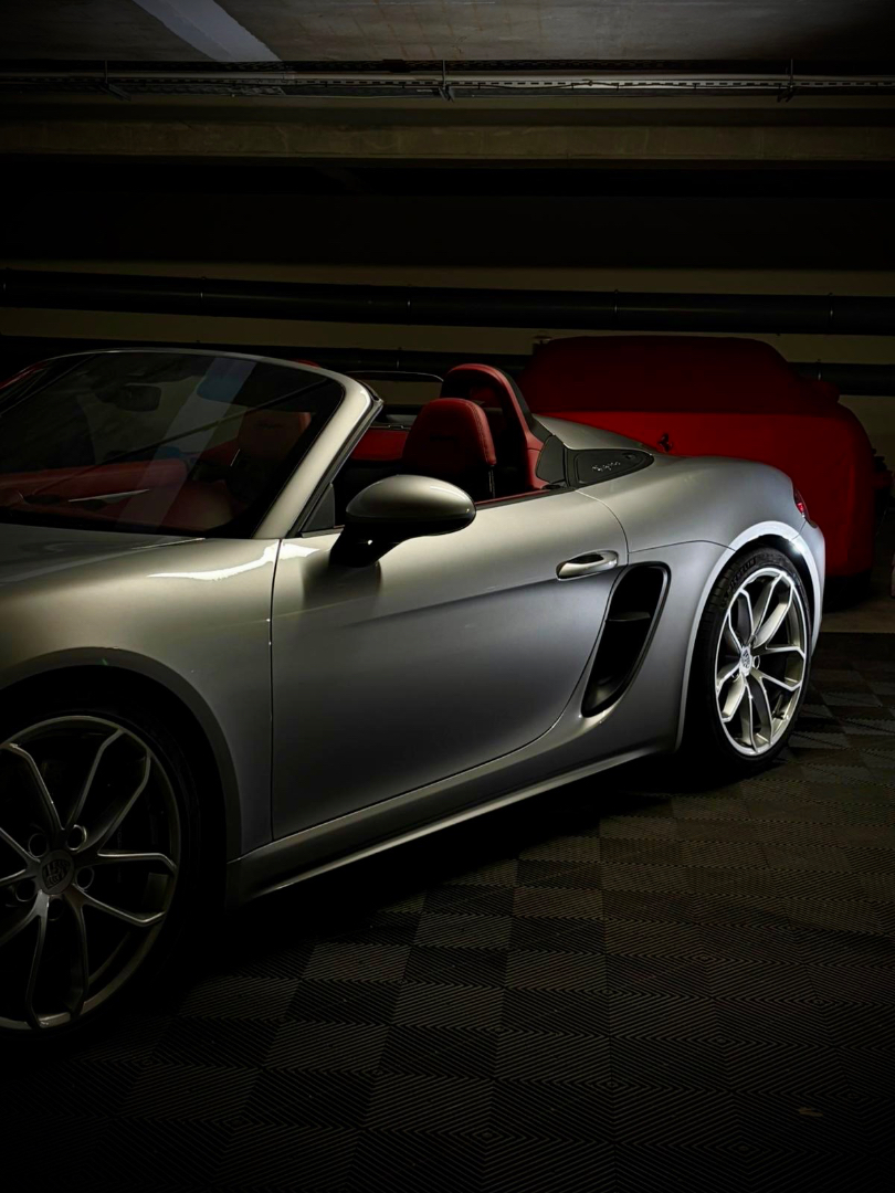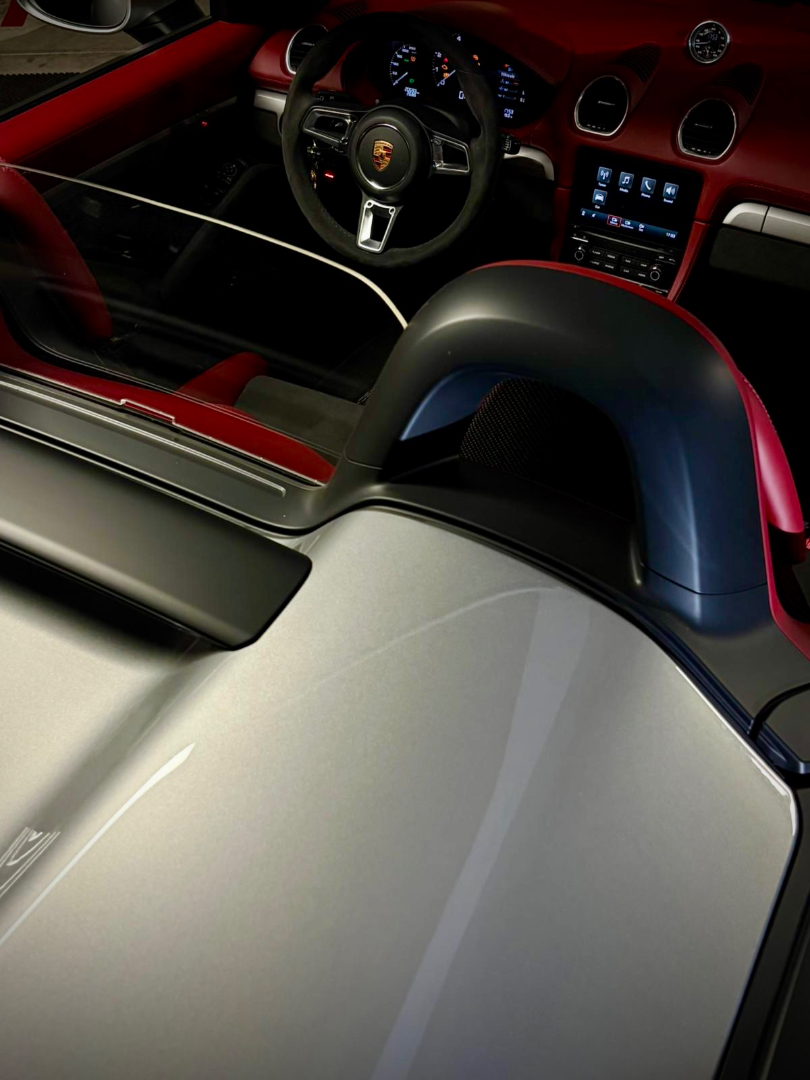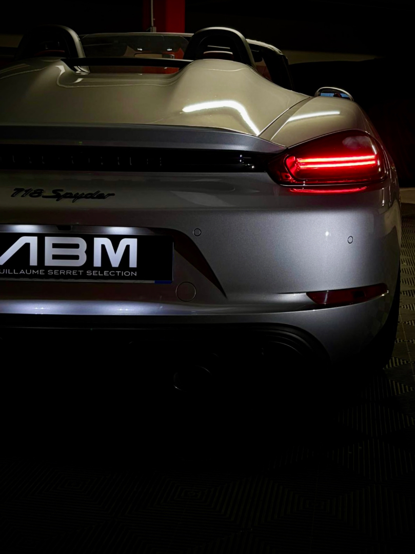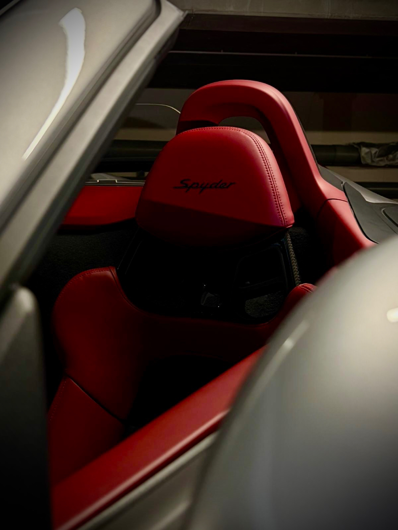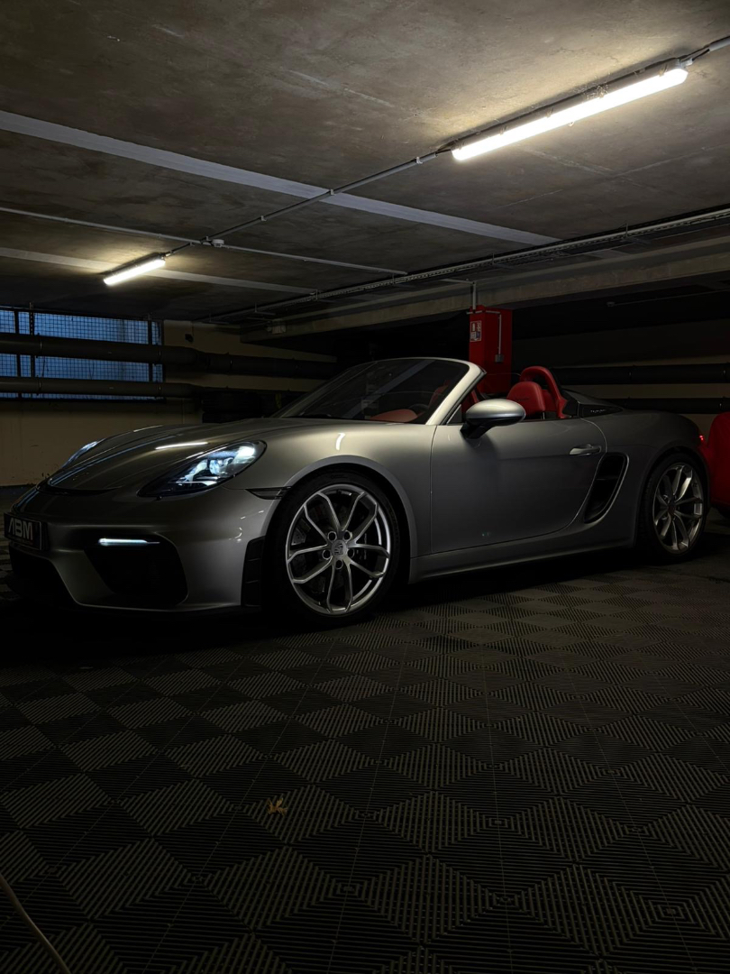 Cette 718 Spyder, livrée en Argent GT métallisé avec intérieur cuir Rouge / Alcantara noir et capote rouge, incarne la définition moderne du roadster Porsche puriste.