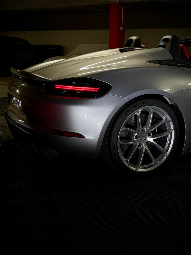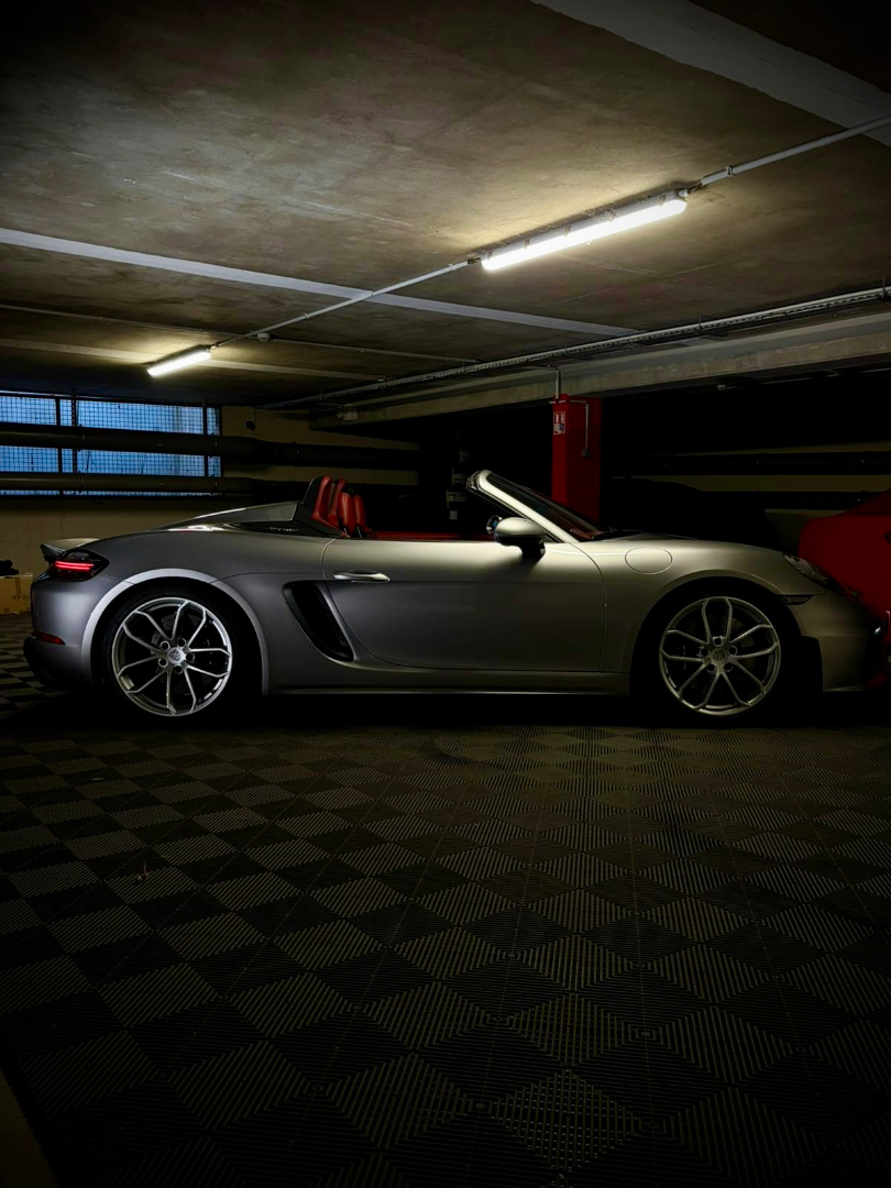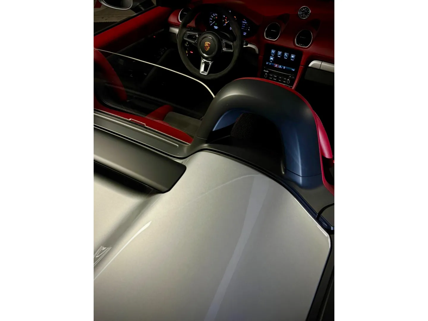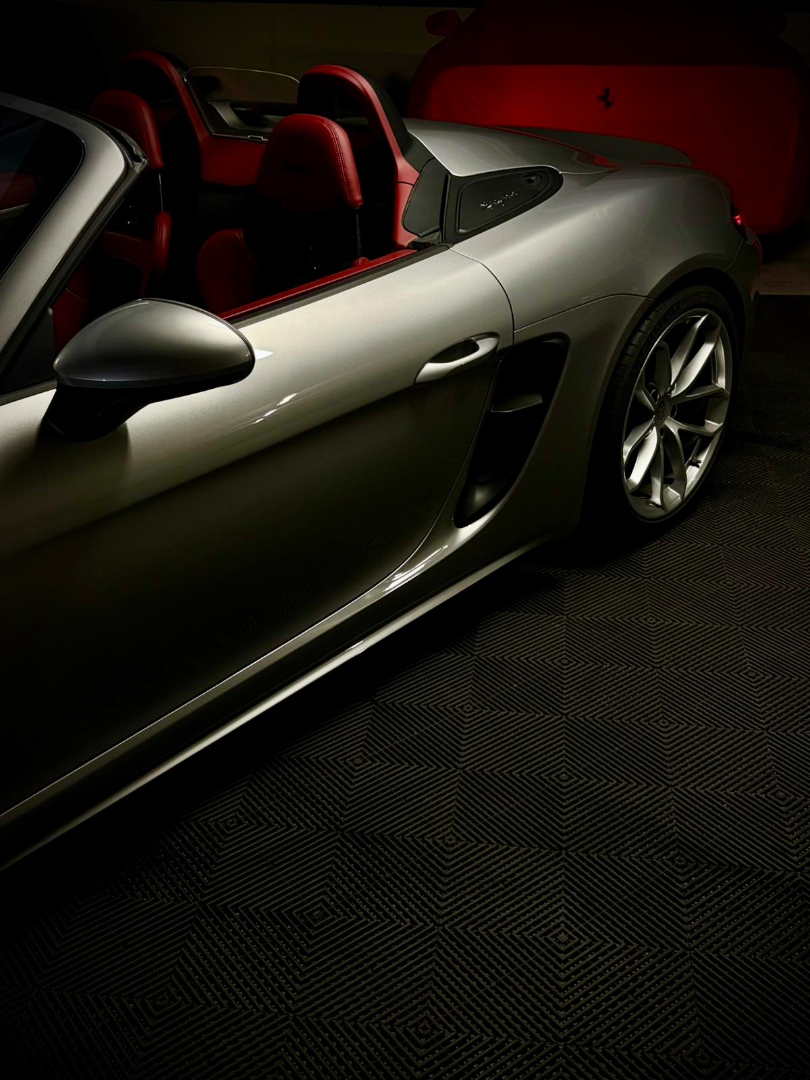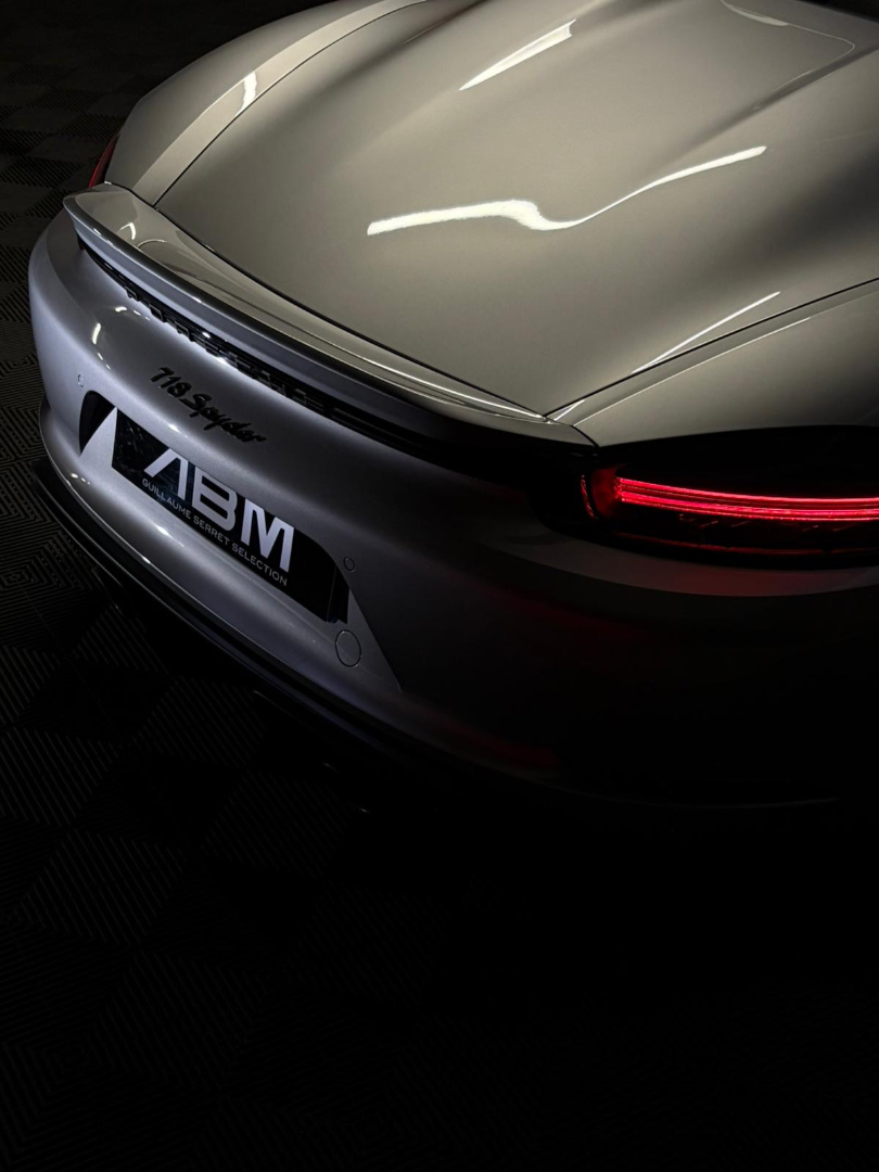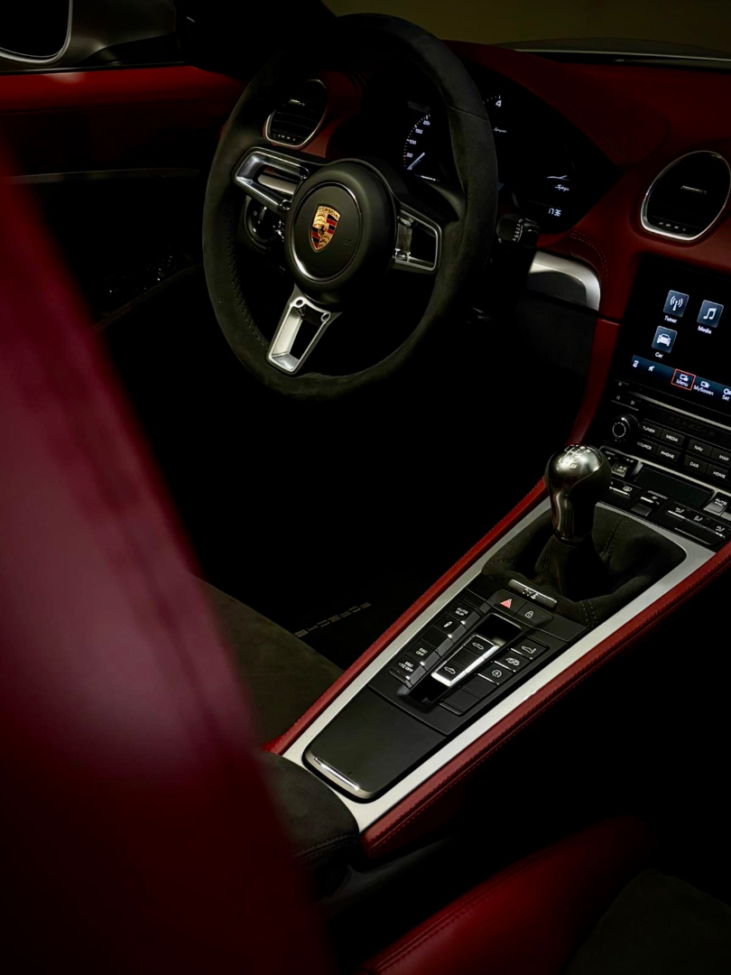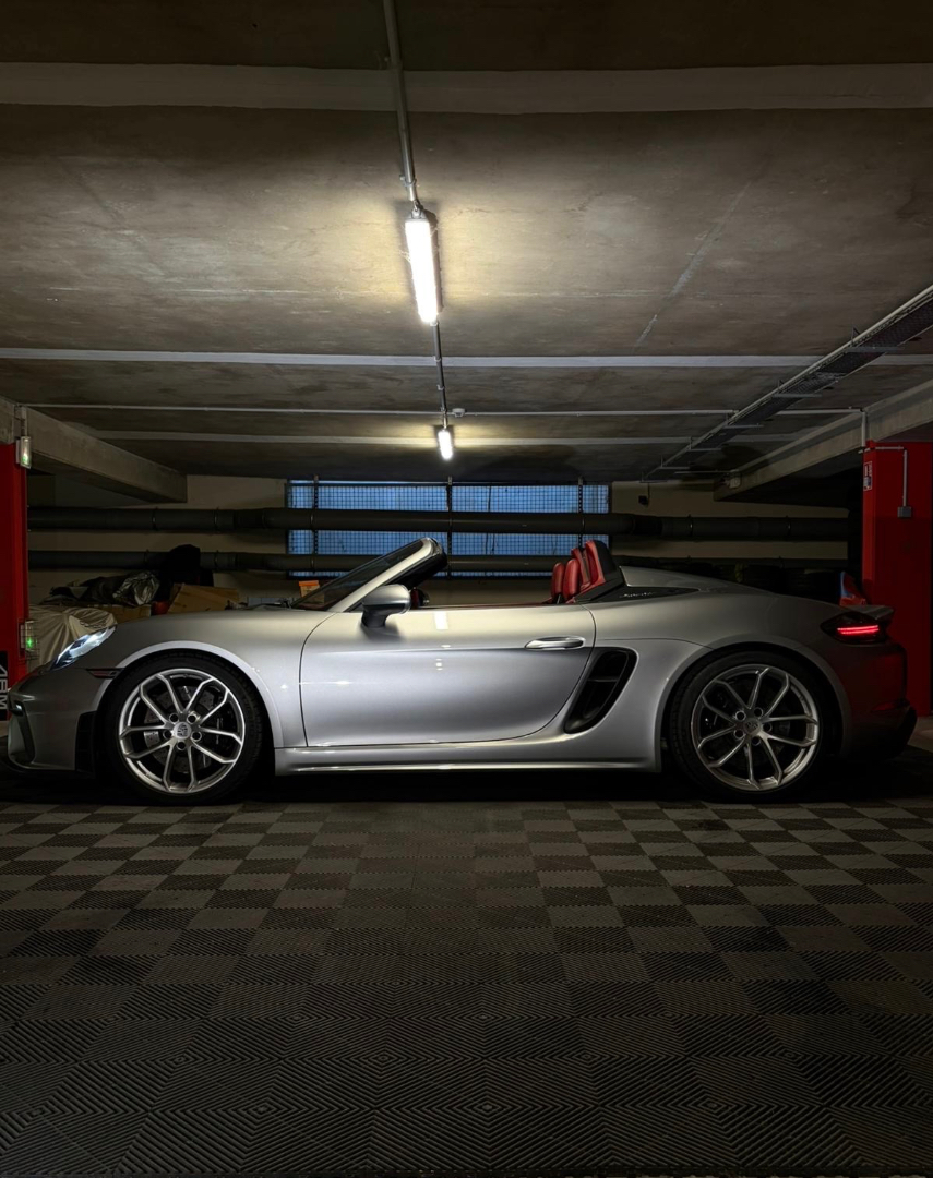 Cette 718 Spyder, livrée en Argent GT métallisé avec intérieur cuir Rouge / Alcantara noir et capote rouge, incarne la définition moderne du roadster Porsche puriste.