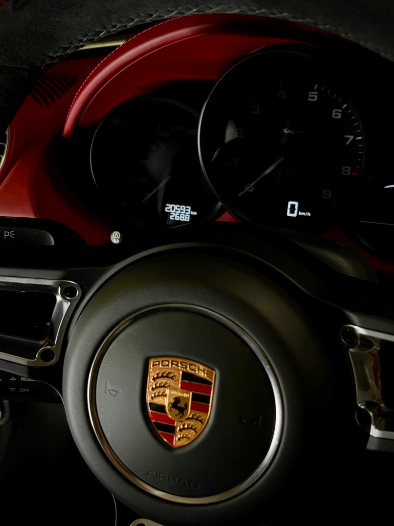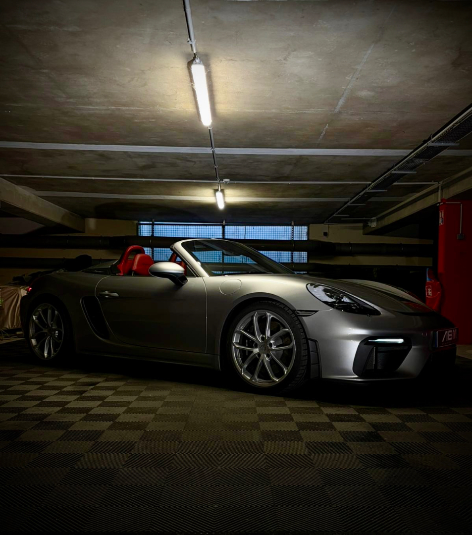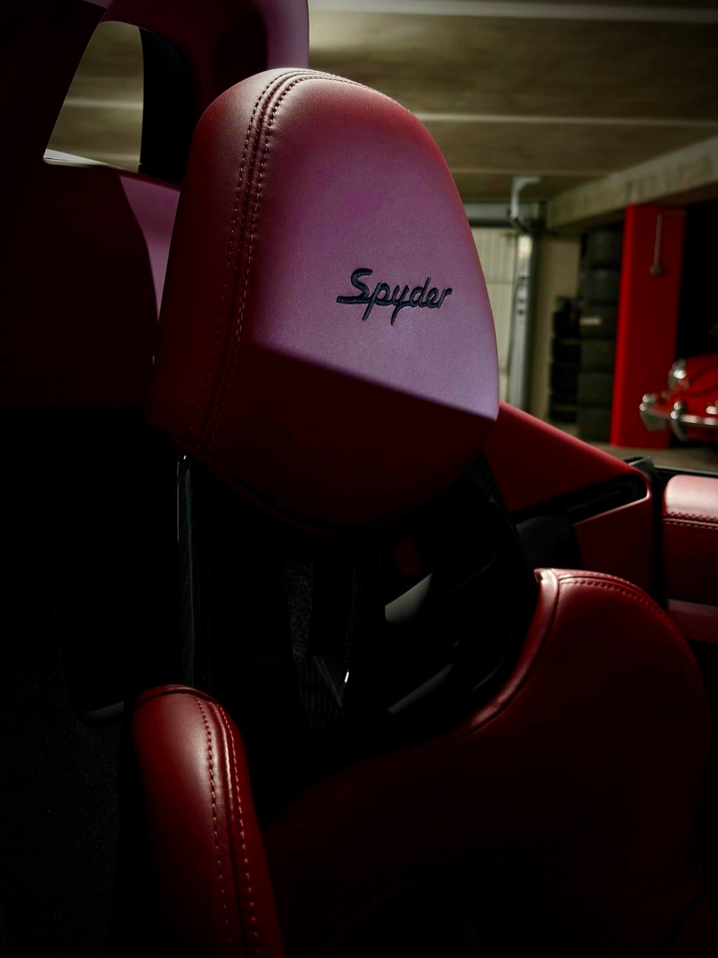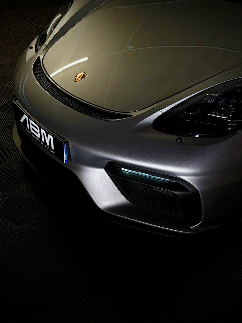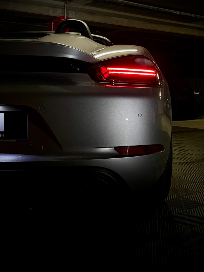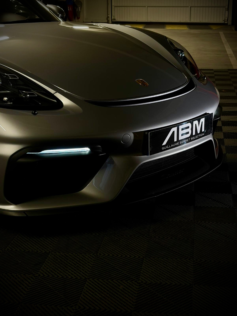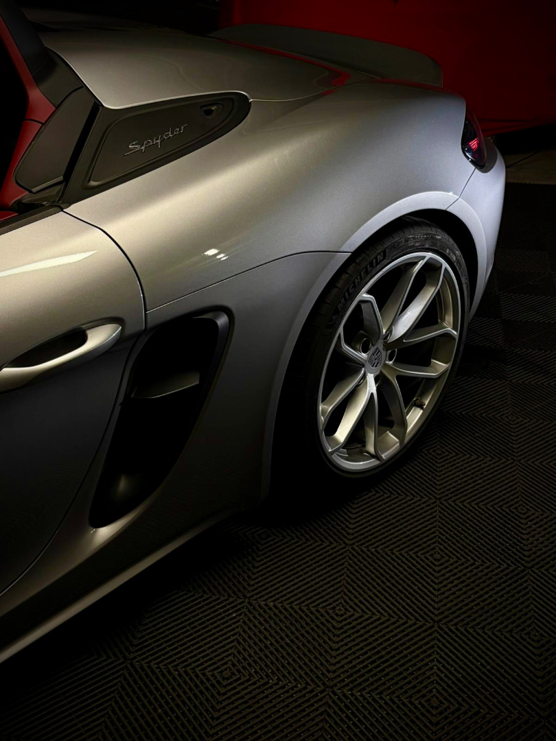 Cette 718 Spyder, livrée en Argent GT métallisé avec intérieur cuir Rouge / Alcantara noir et capote rouge, incarne la définition moderne du roadster Porsche puriste.