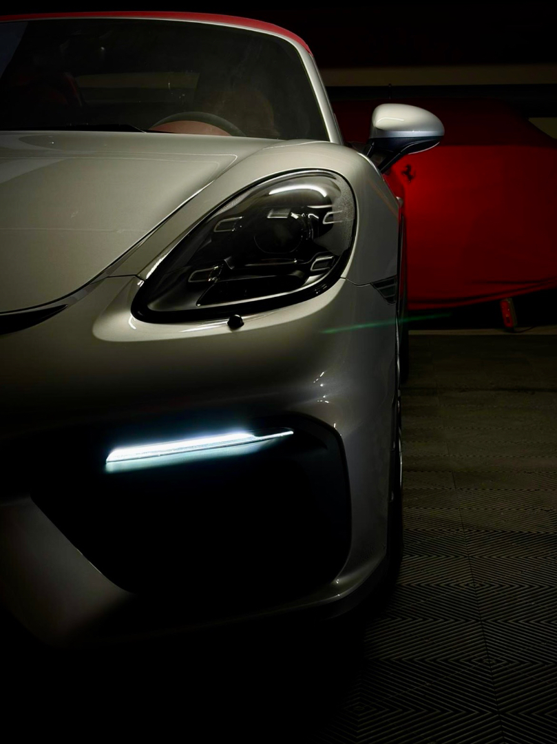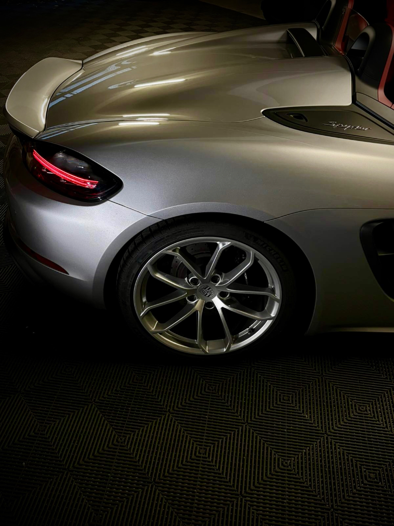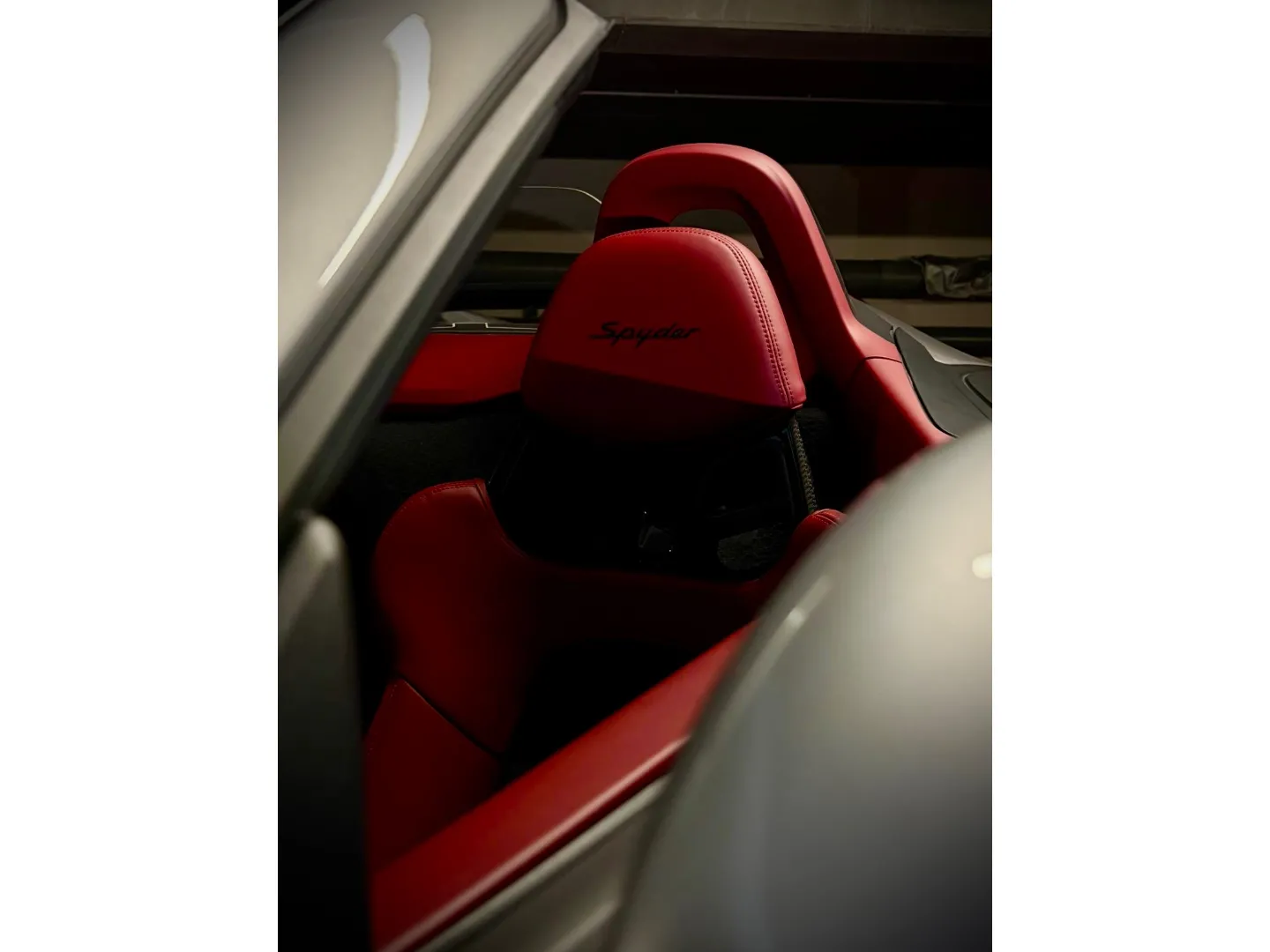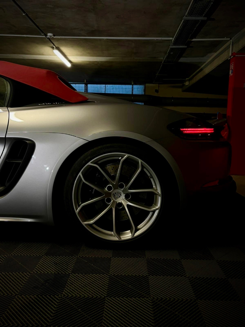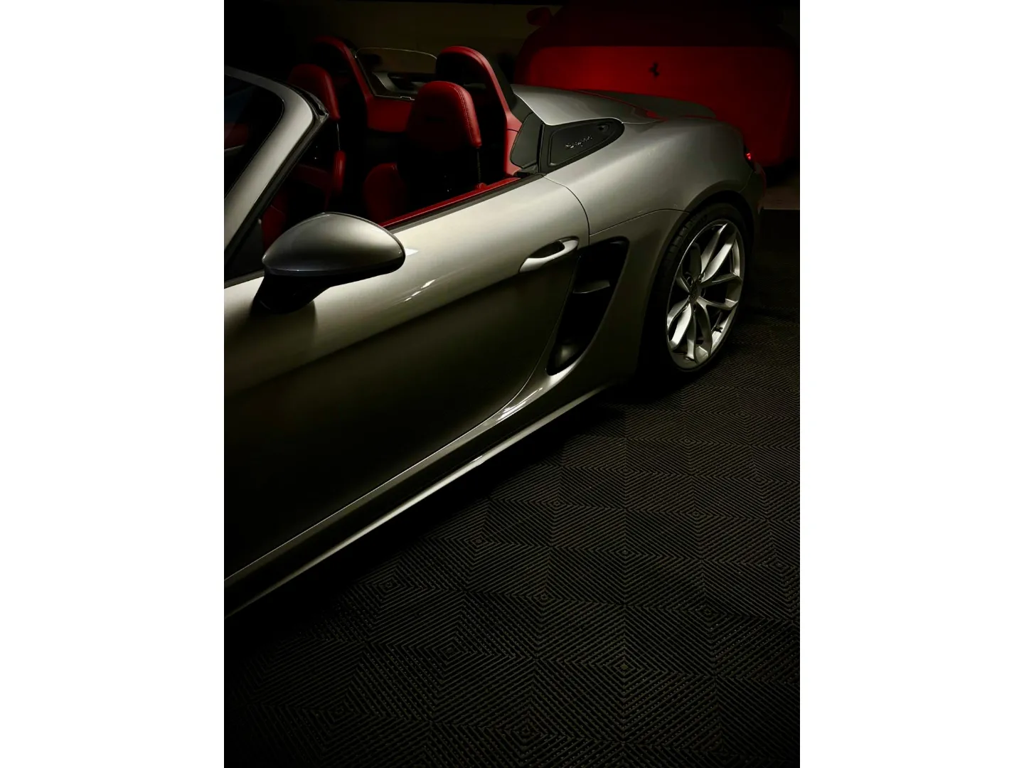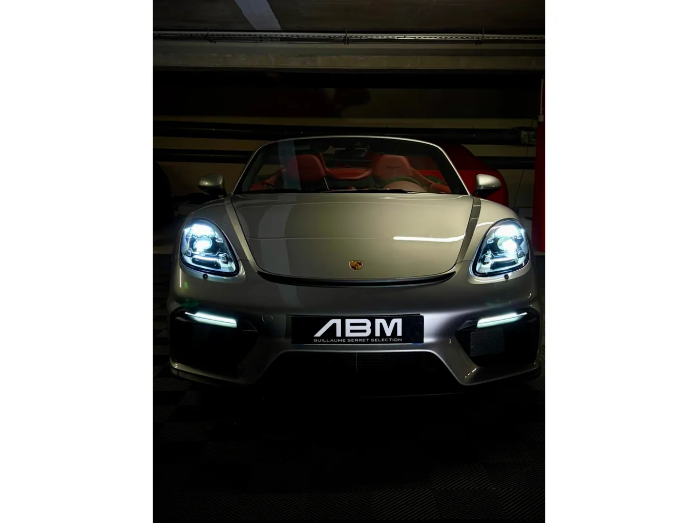Cette 718 Spyder, livrée en Argent GT métallisé avec intérieur cuir Rouge / Alcantara noir et capote rouge, incarne la définition moderne du roadster Porsche puriste.