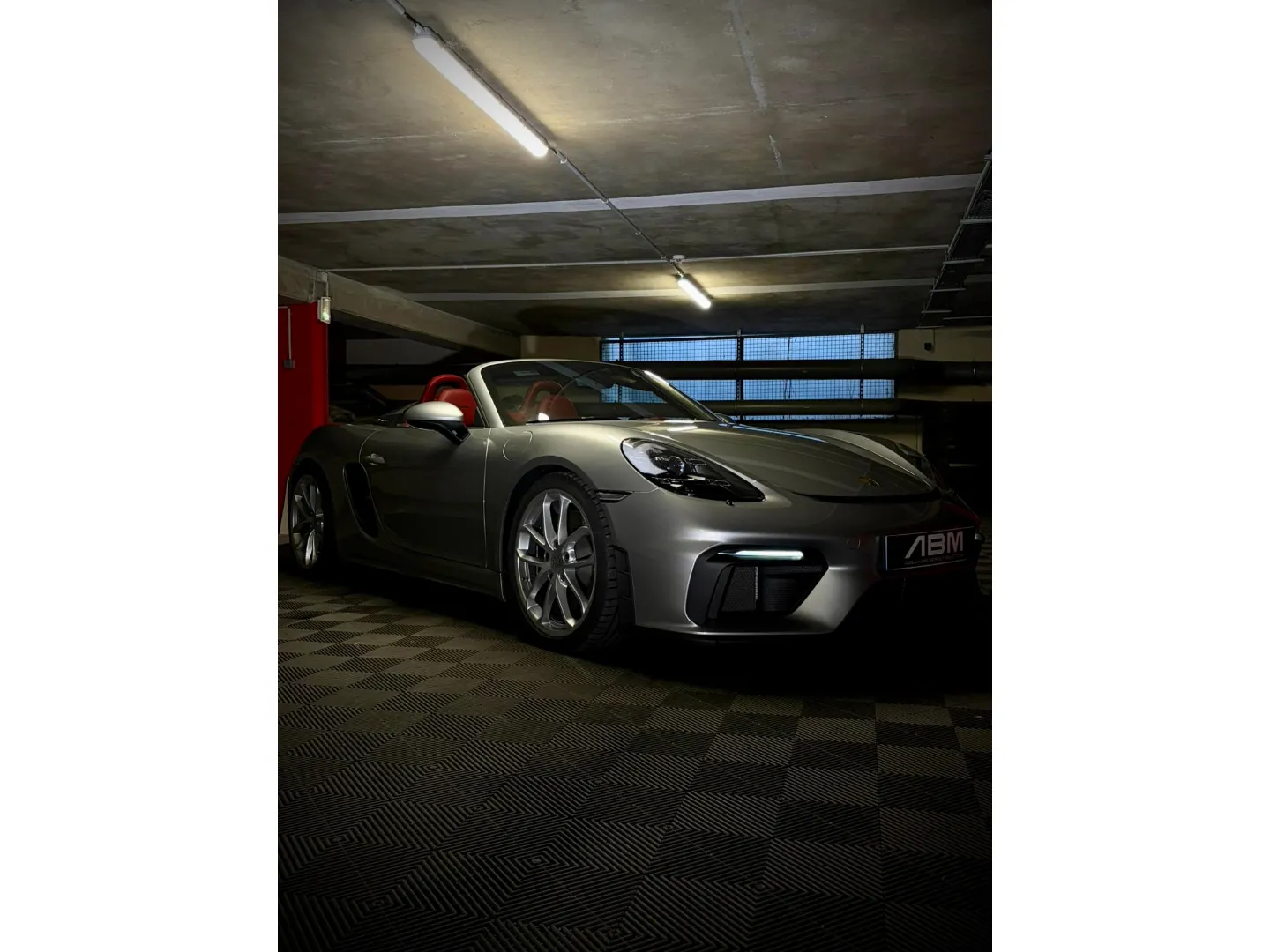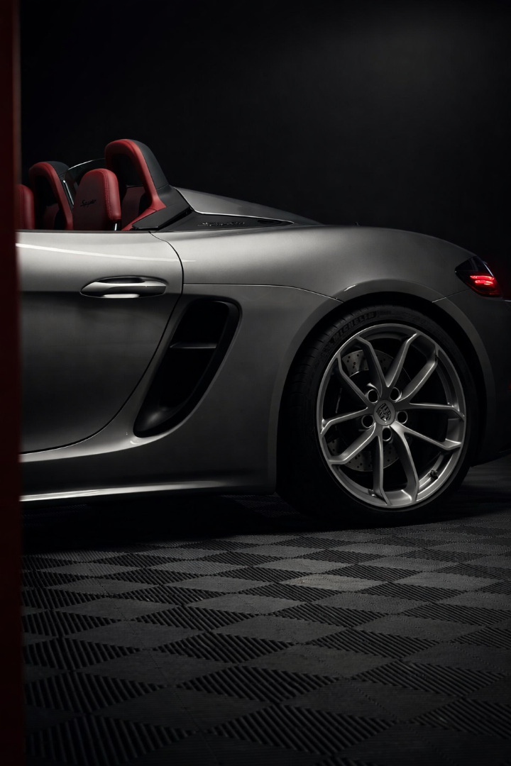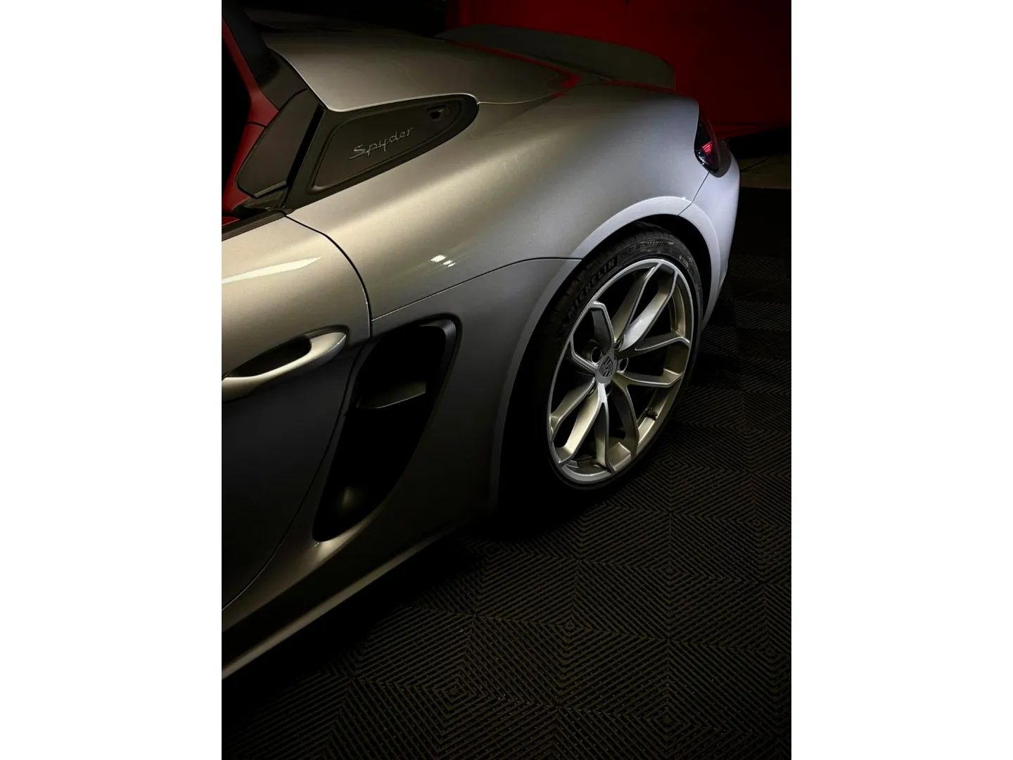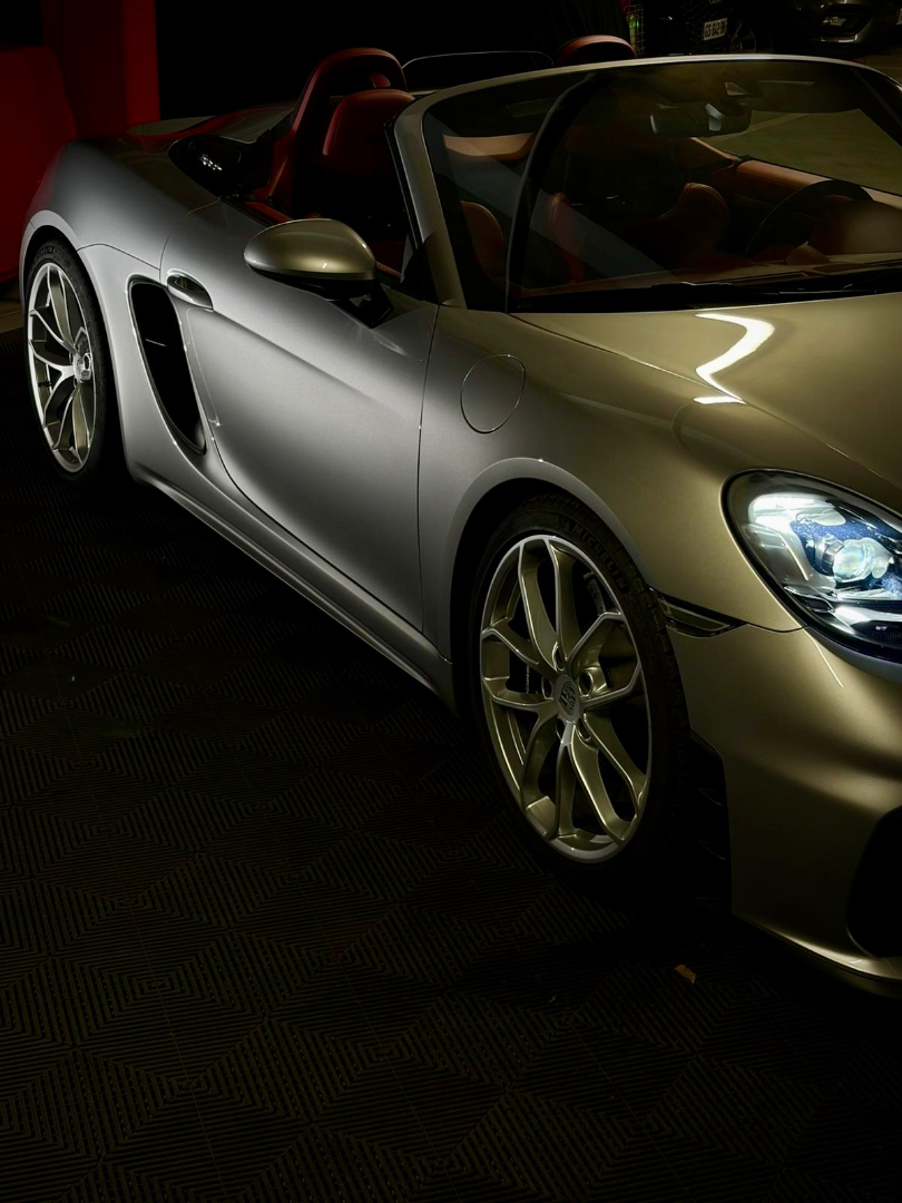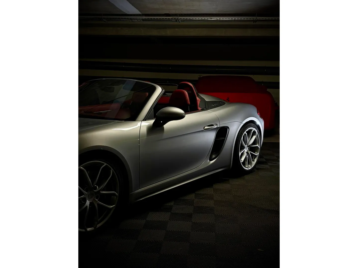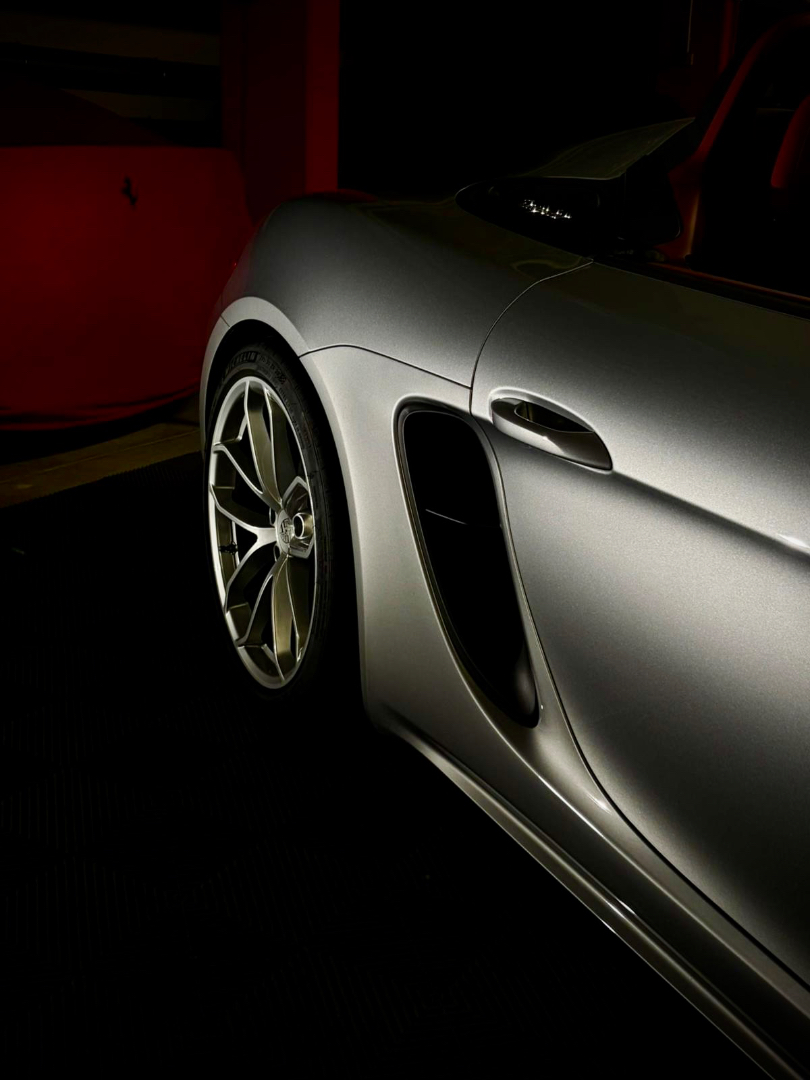 Cette 718 Spyder, livrée en Argent GT métallisé avec intérieur cuir Rouge / Alcantara noir et capote rouge, incarne la définition moderne du roadster Porsche puriste.