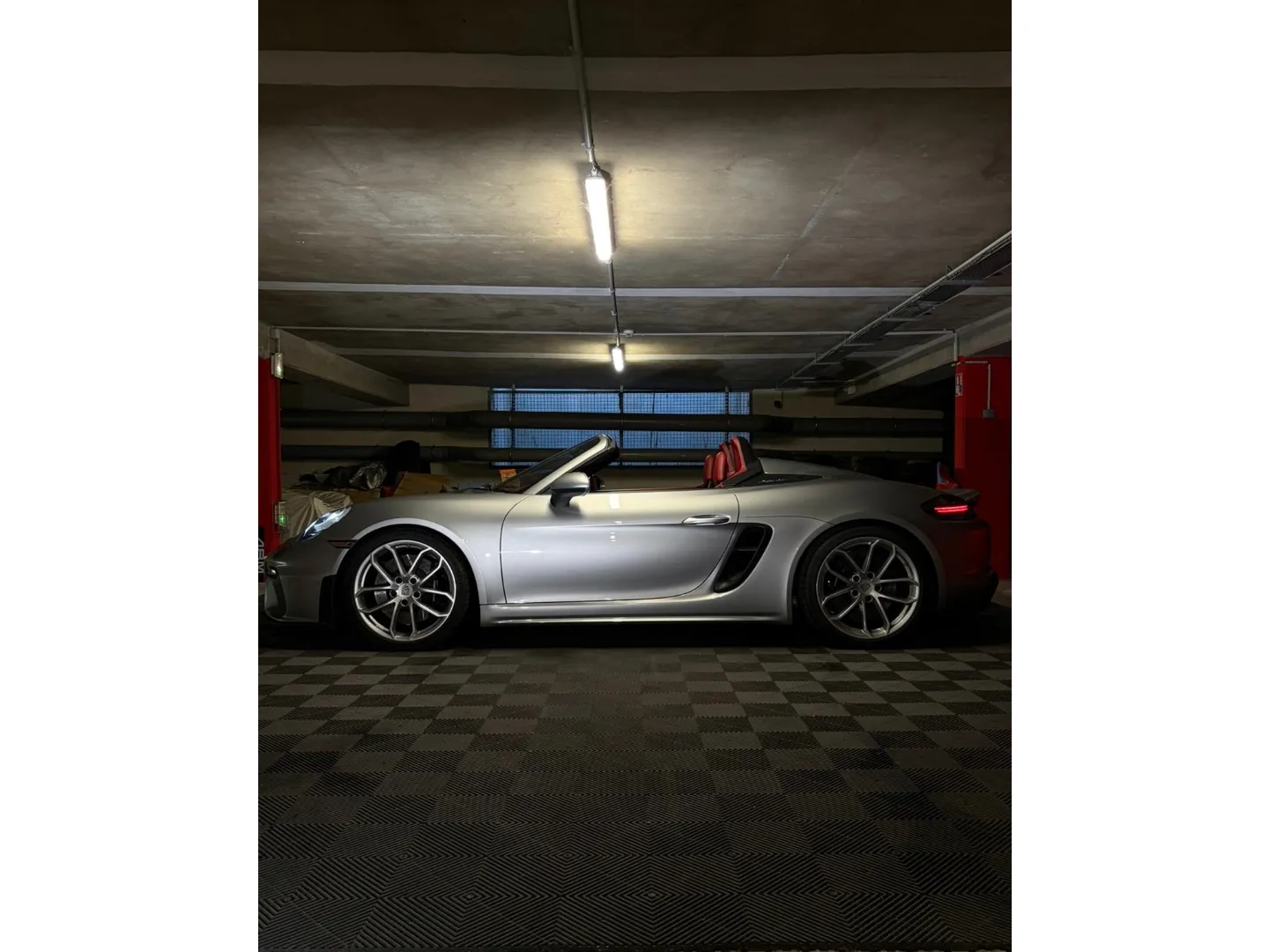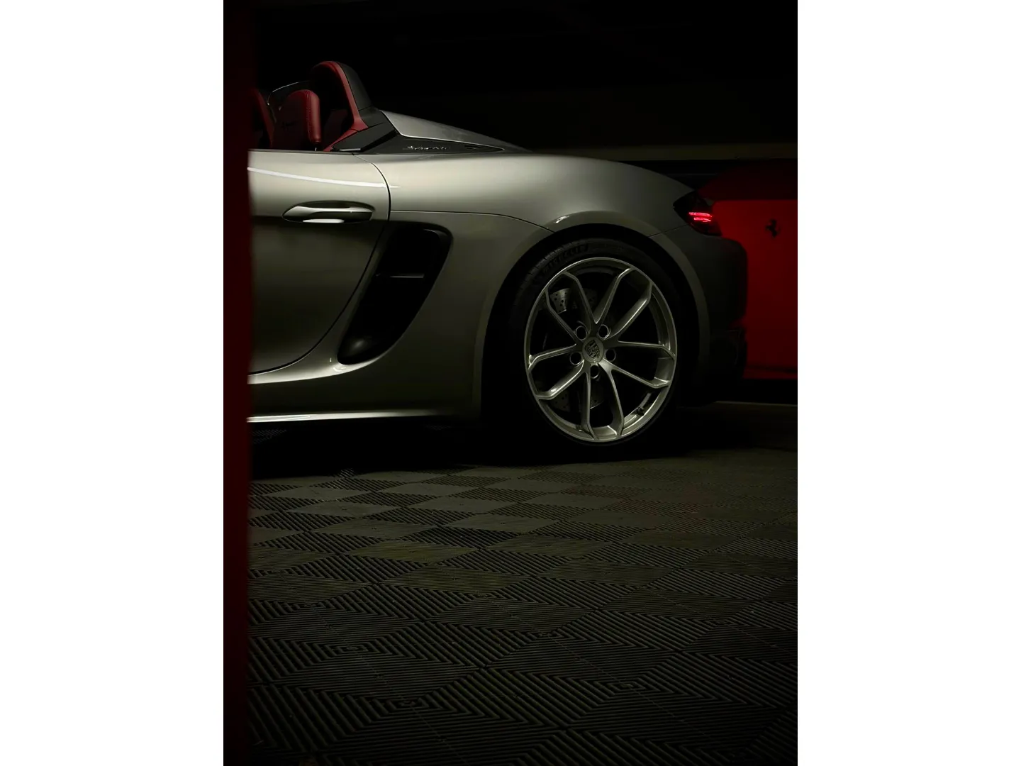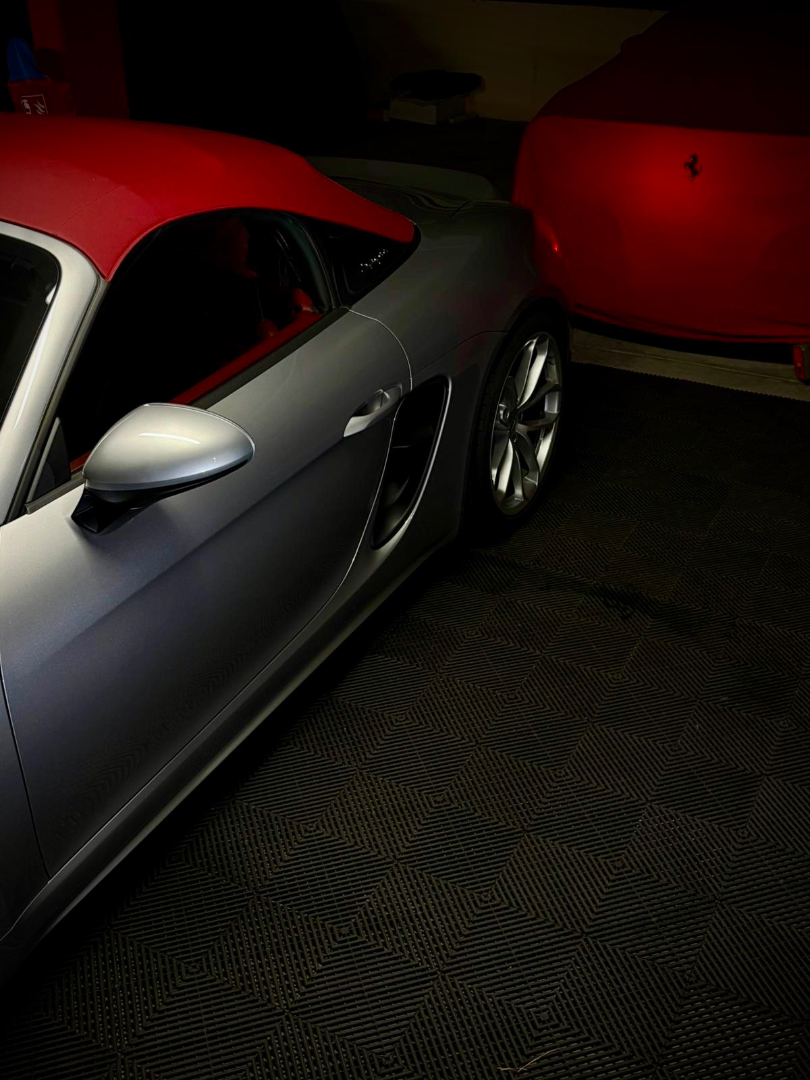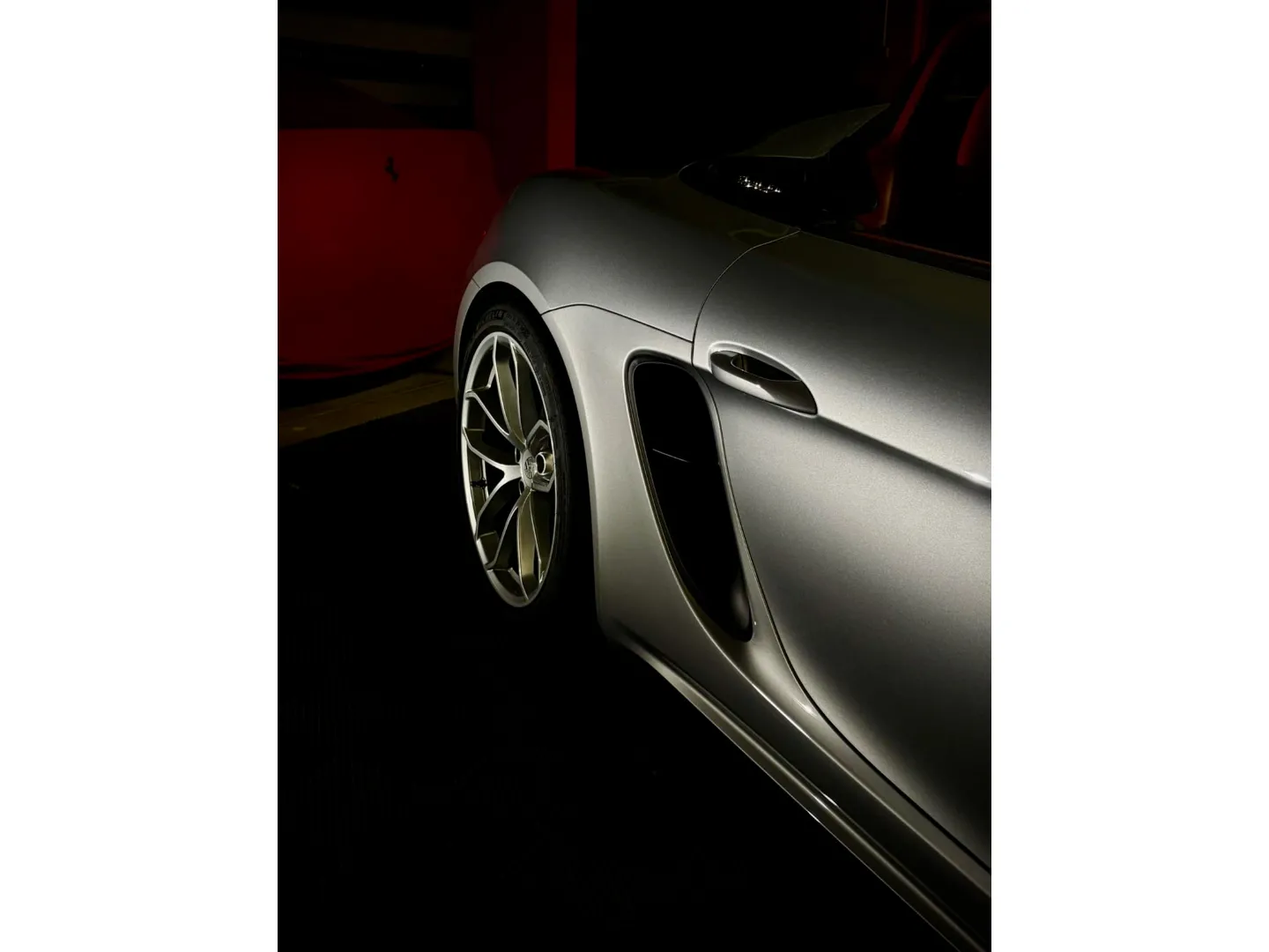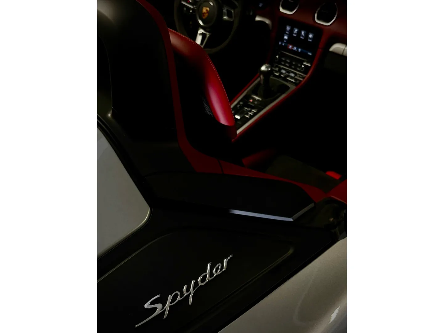 Cette 718 Spyder, livrée en Argent GT métallisé avec intérieur cuir Rouge / Alcantara noir et capote rouge, incarne la définition moderne du roadster Porsche puriste.
