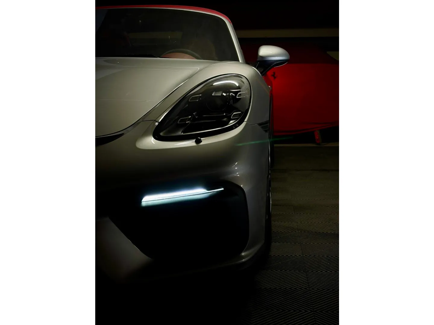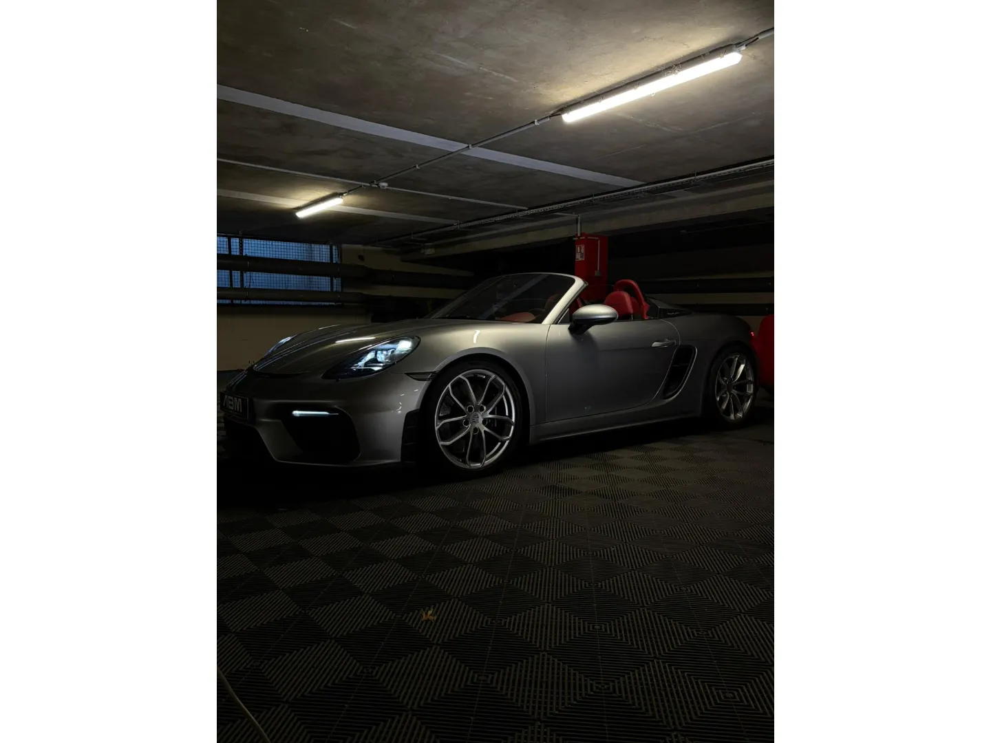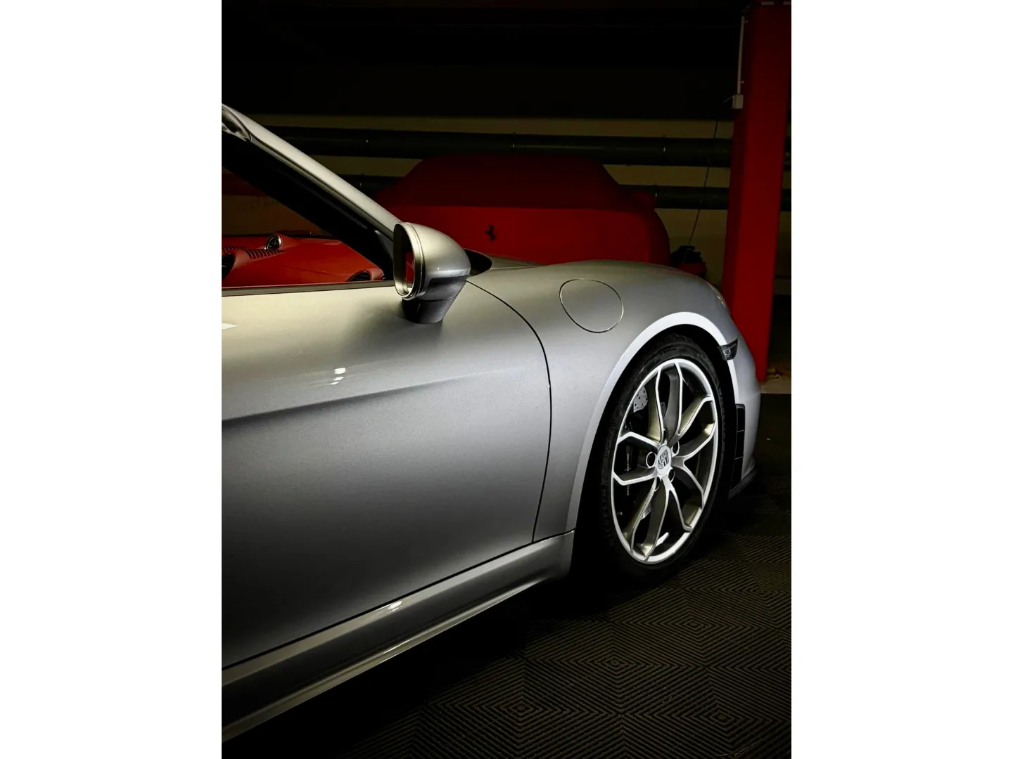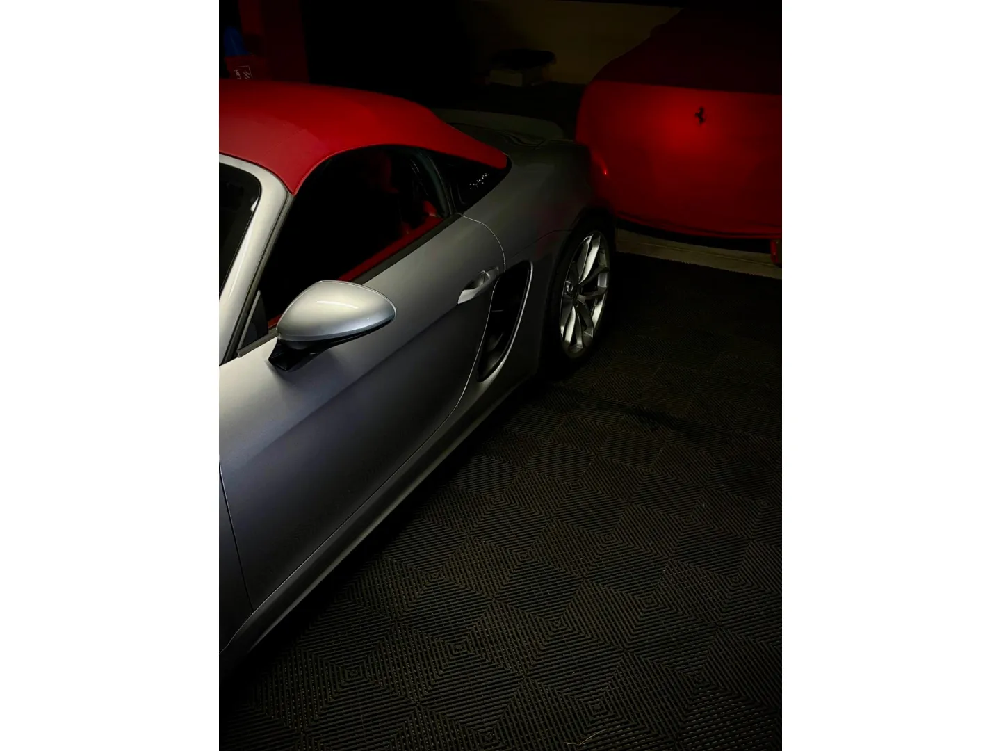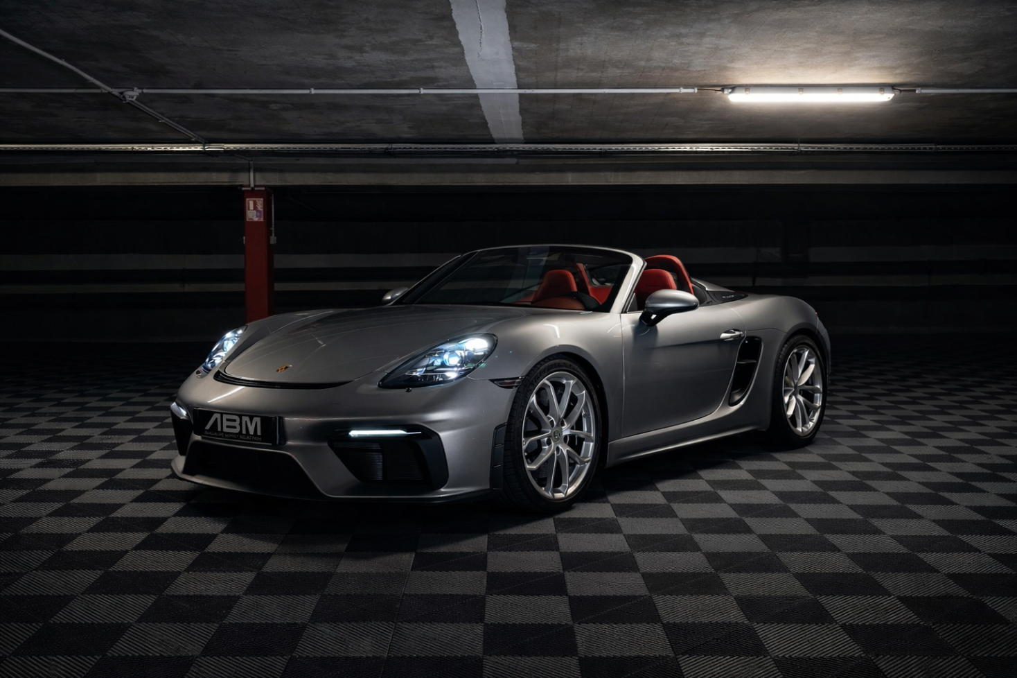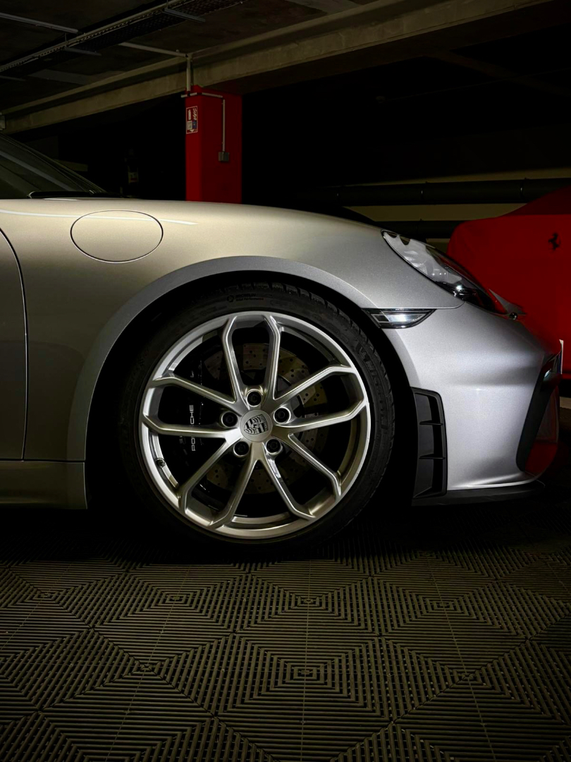 Cette 718 Spyder, livrée en Argent GT métallisé avec intérieur cuir Rouge / Alcantara noir et capote rouge, incarne la définition moderne du roadster Porsche puriste.