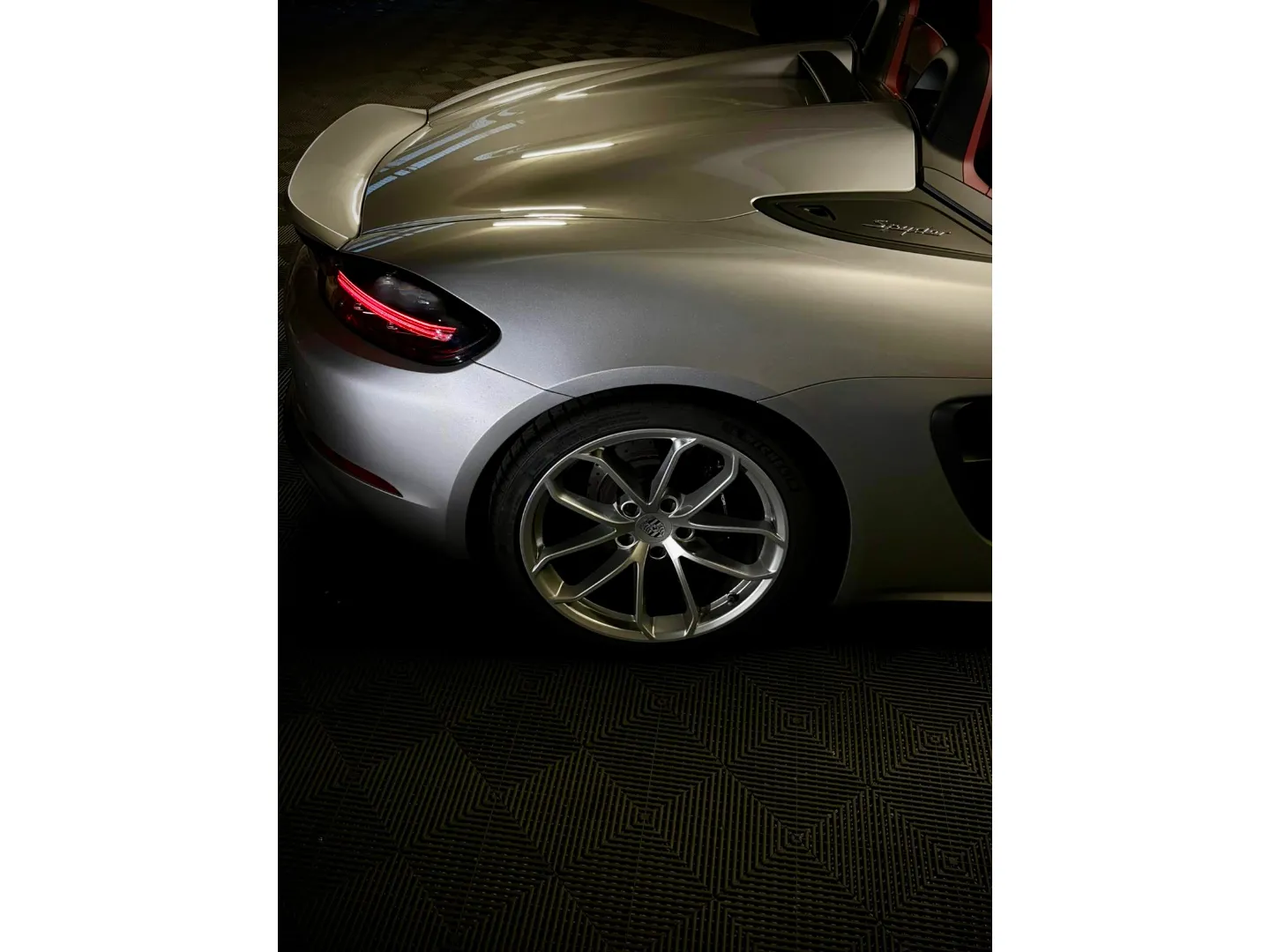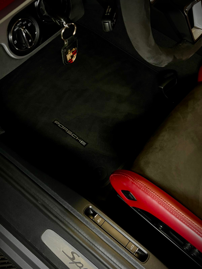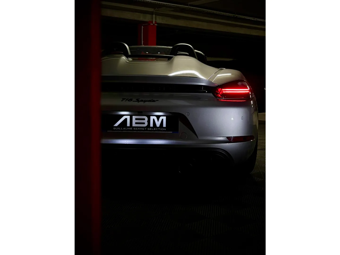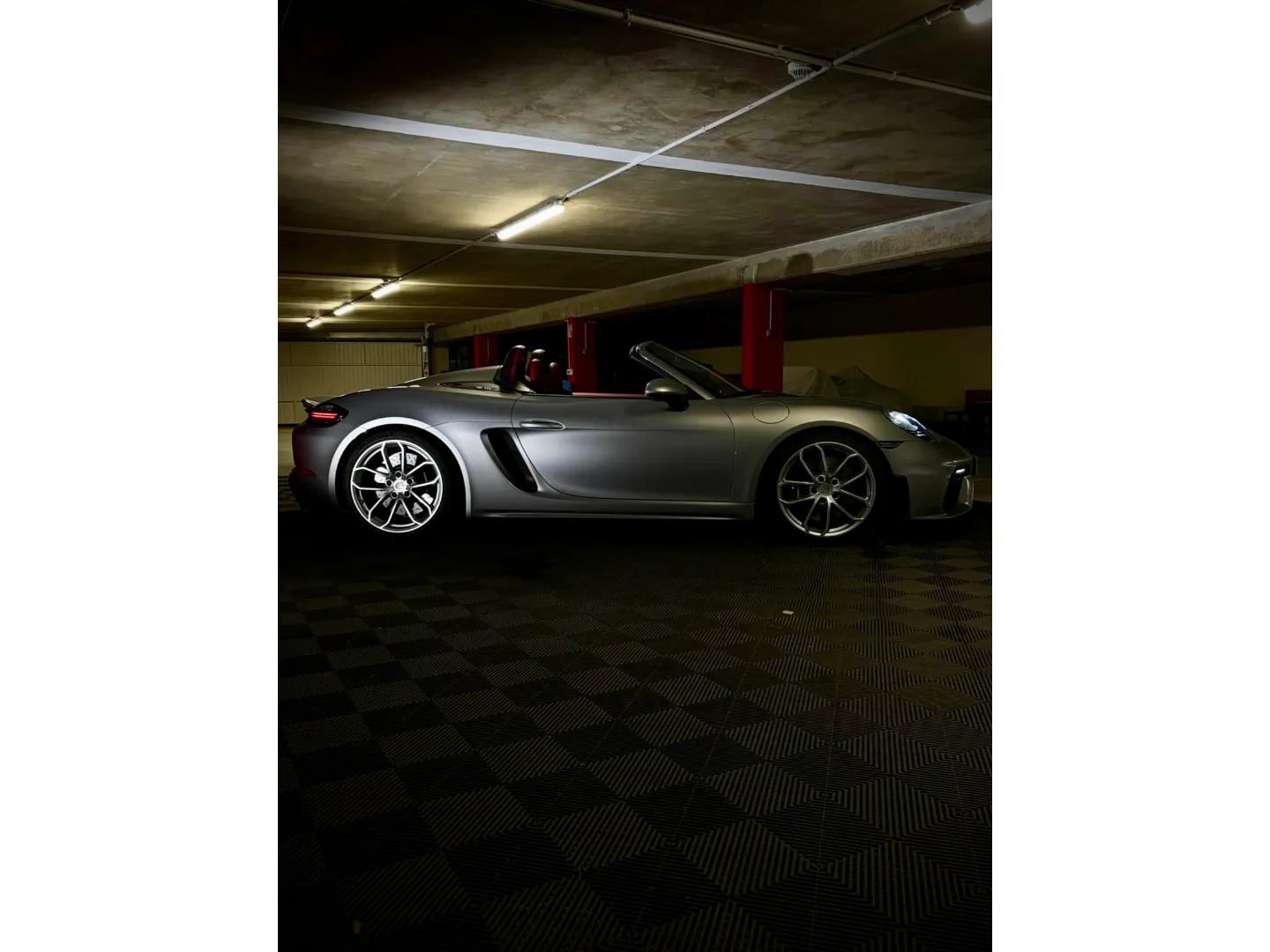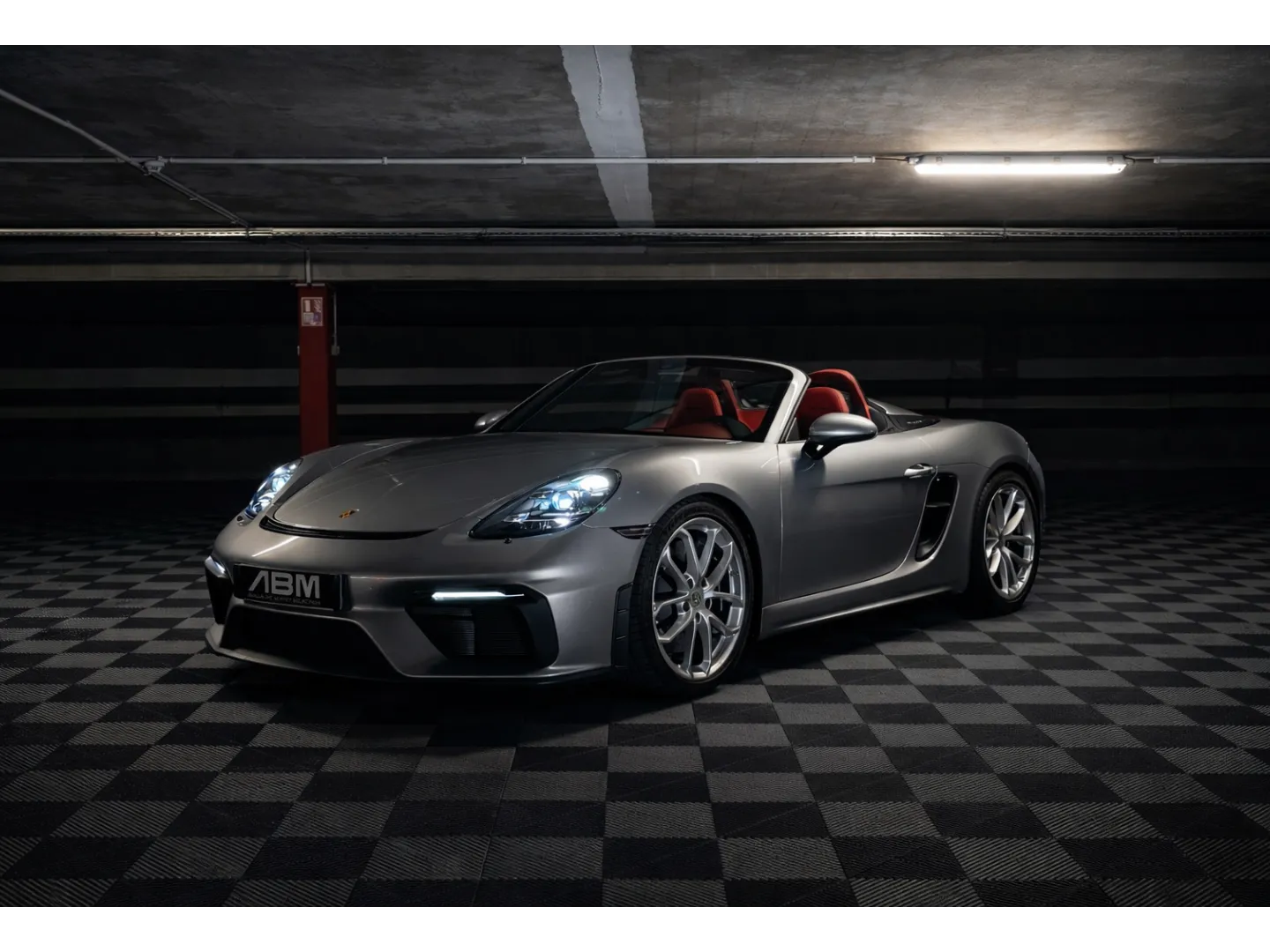 Cette 718 Spyder, livrée en Argent GT métallisé avec intérieur cuir Rouge / Alcantara noir et capote rouge, incarne la définition moderne du roadster Porsche puriste.