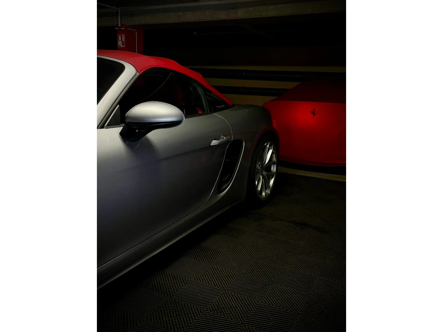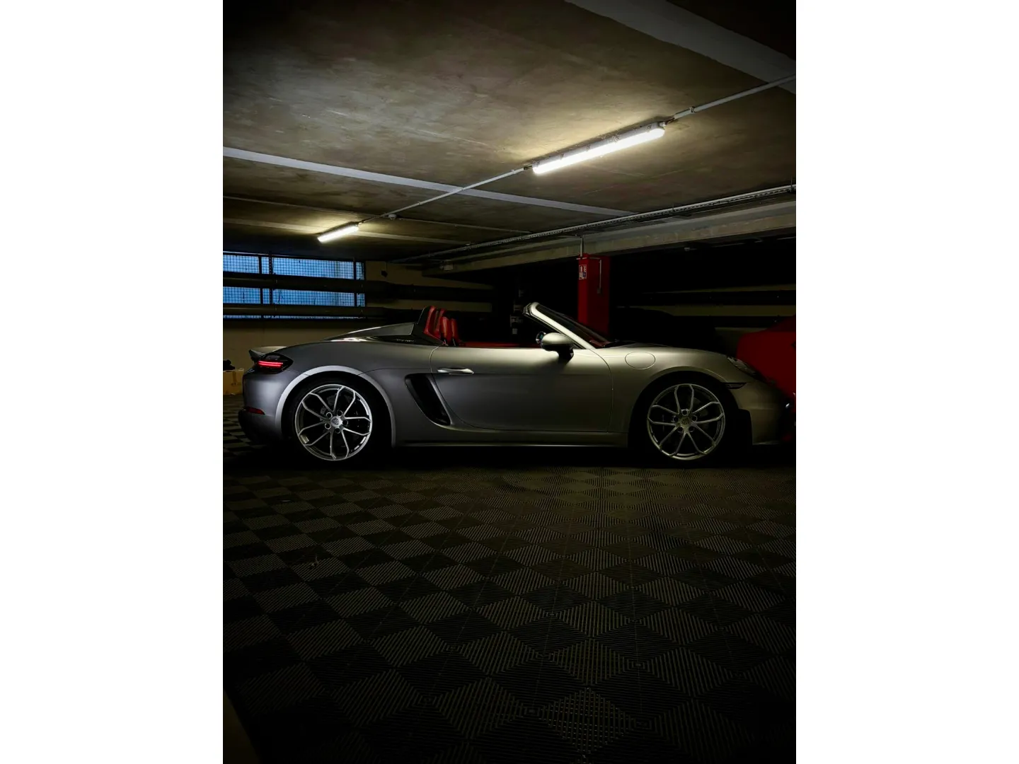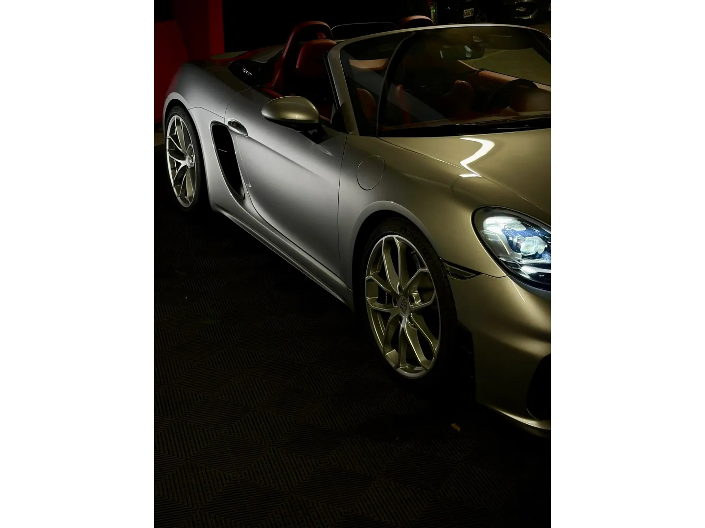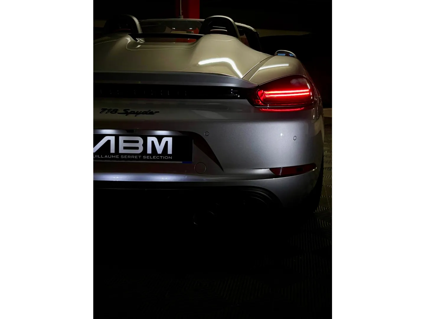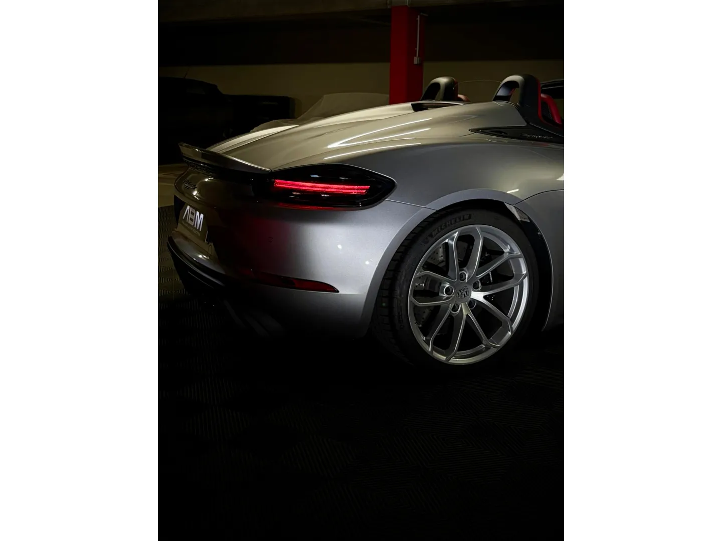 Cette 718 Spyder, livrée en Argent GT métallisé avec intérieur cuir Rouge / Alcantara noir et capote rouge, incarne la définition moderne du roadster Porsche puriste.
